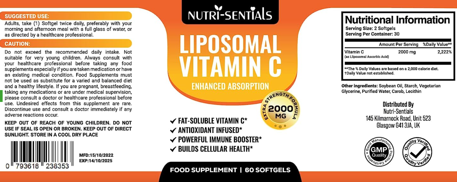 Liposomal Vitamin C Capsules - 2000mg Pure Extra High Strength Formulation | 60 Soft Gels | Pure Vegan Liposomal Vitamin C | Immune Booster |
