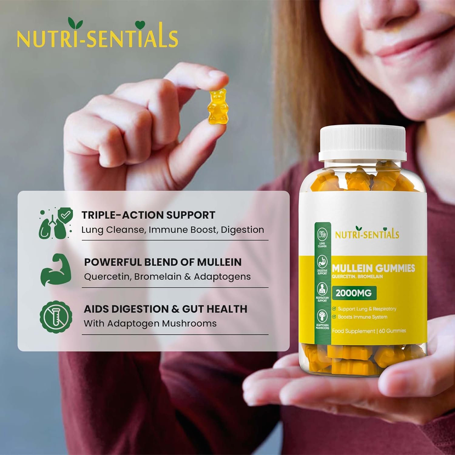Mullein Gummies 2000mg – Respiratory Lung Health Supplement with Adaptogen Mushrooms, Mullein Leaf Extract – Natural Lung Cleanse for Adults, Vegan & Non-GMO | Immune Boost 60 Gummies