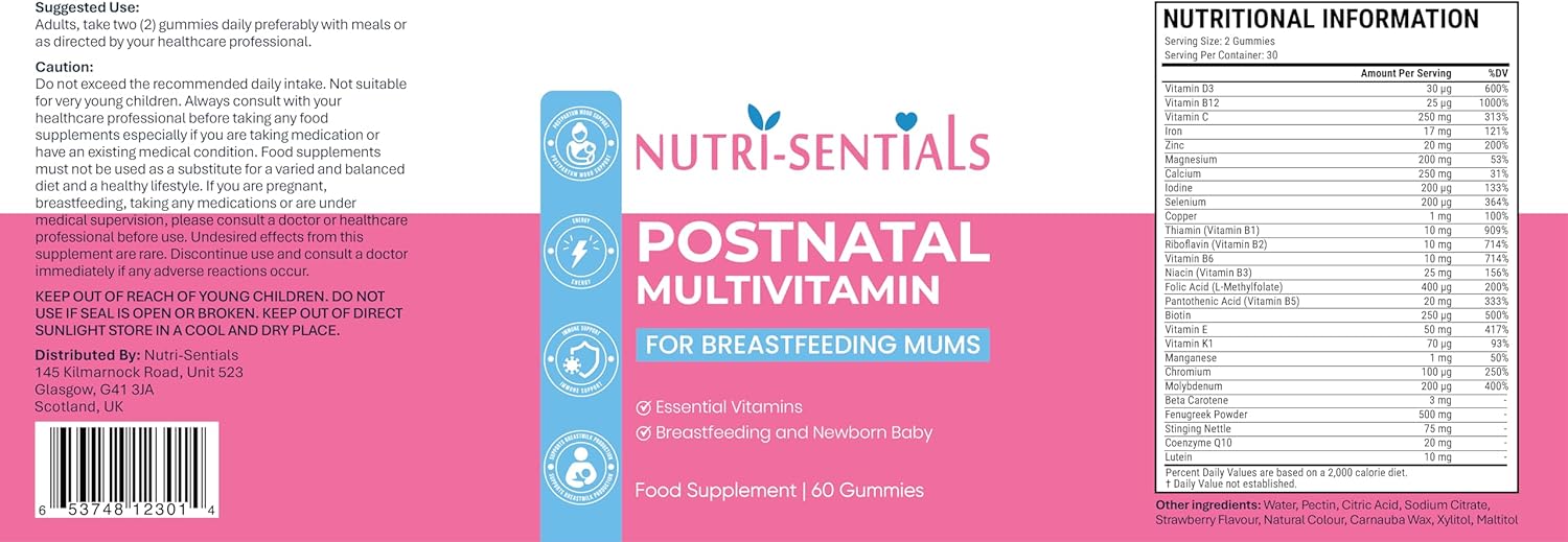 Postnatal Vitamins Gummies- Multivitamin Breastfeeding Supplement for Mums- New Mum Vitamins for Energy, Immunity & Breastfeeding Support- Organic Lactation Supplement- 60 Gummies